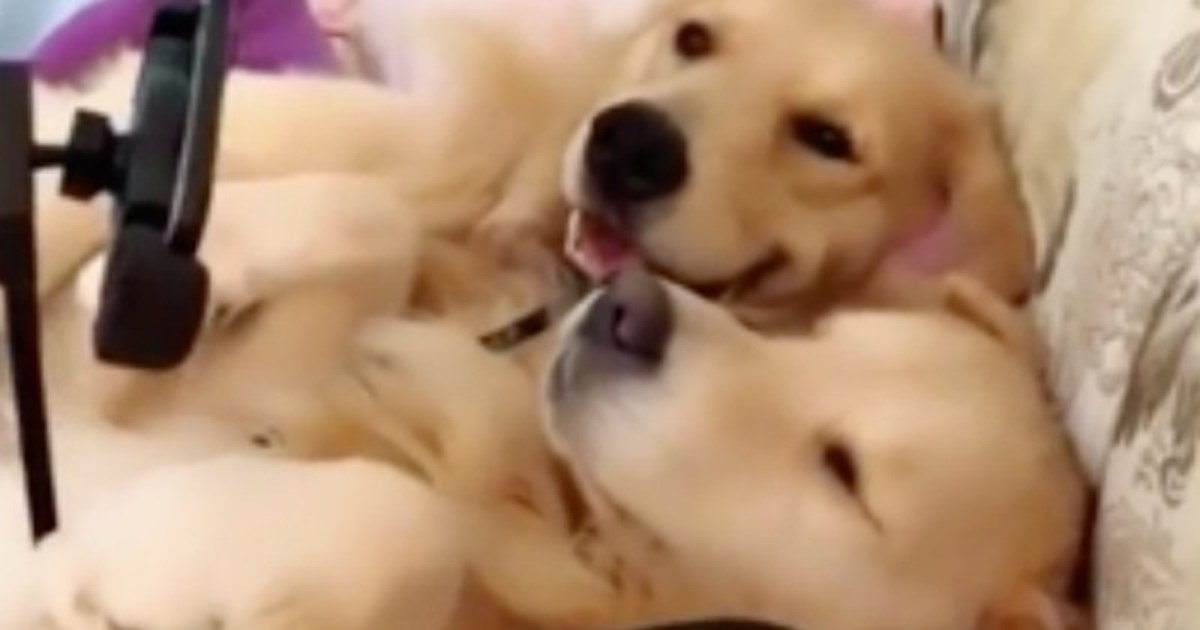 Golden Retriever Puppy Is Totally Jealous of Toy Dog. Yellow Collar Home Loved Goldens and home loved. Now this is absolutely priceless.